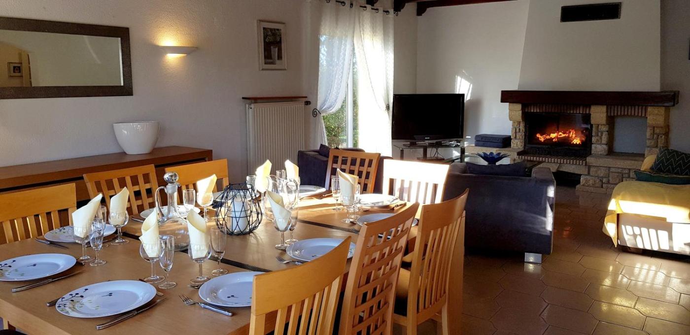The villa has 6 bedrooms, a TV with satellite channels, a fully equipped kitchen with a dishwasher and an oven, a washing machine, and 3 bathrooms with a shower. There is also a seating area and a fireplace.