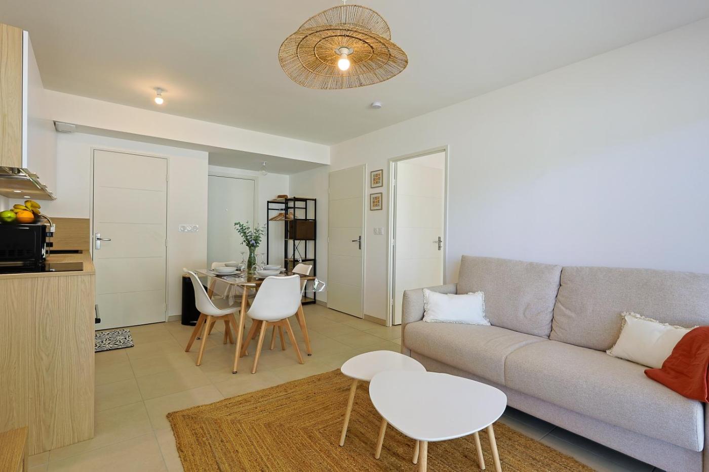 One-Bedroom Apartment. This apartment includes 1 living room, 1 separate bedroom and 1 bathroom with a shower and a hairdryer. Guests can make meals in the kitchen that is fitted with a refrigerator, kitchenware, an oven and a microwave. This apartment has a washing machine, a tea and coffee maker, a TV with streaming services and a terrace. The unit has 2 beds.