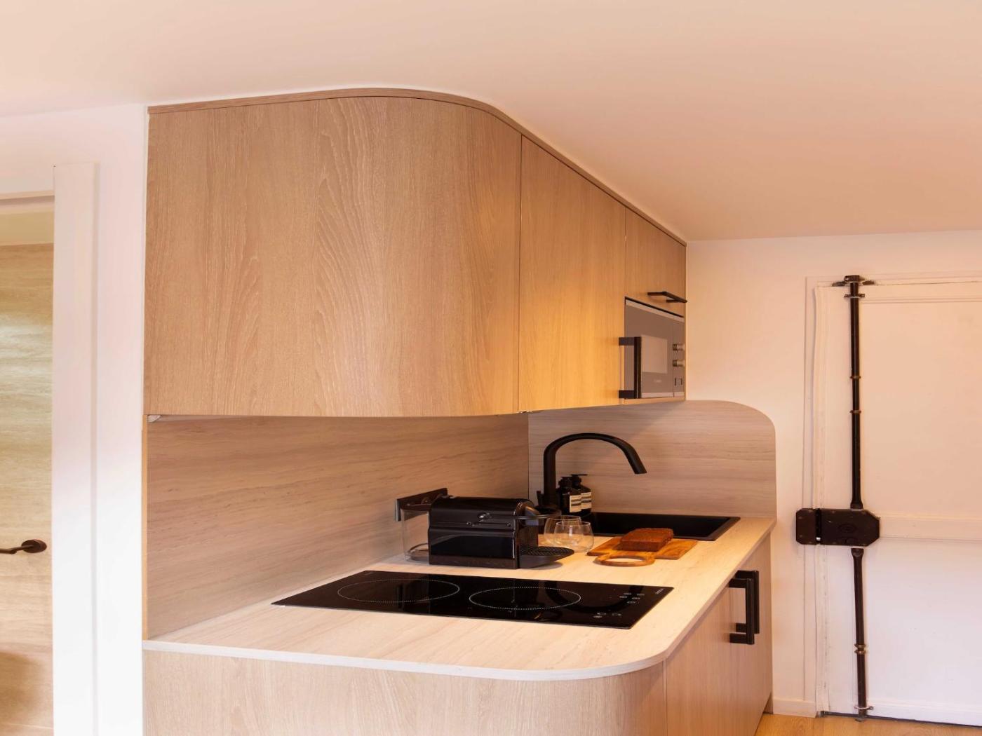 Apartment. The fireplace is the standout feature of this apartment. Guests can make meals in the kitchen that features a stovetop, a refrigerator, kitchenware and a microwave. A seating area with a TV, a desk, a balcony and a private bathroom are available in this apartment. The unit has 1 bed.
