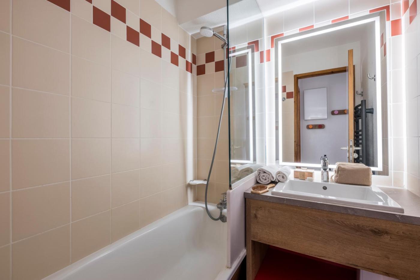 Studio with Sleeping Alcove (4 People). This studio features a living area with two single sofa beds and a sleeping alcove with 2 bunk beds. It has one independent bathroom with a bath or a shower. The fully equipped kitchenette opens on the living area. Some accommodation is south facing. You are kindly requested to clean the kitchen area before departure. ;